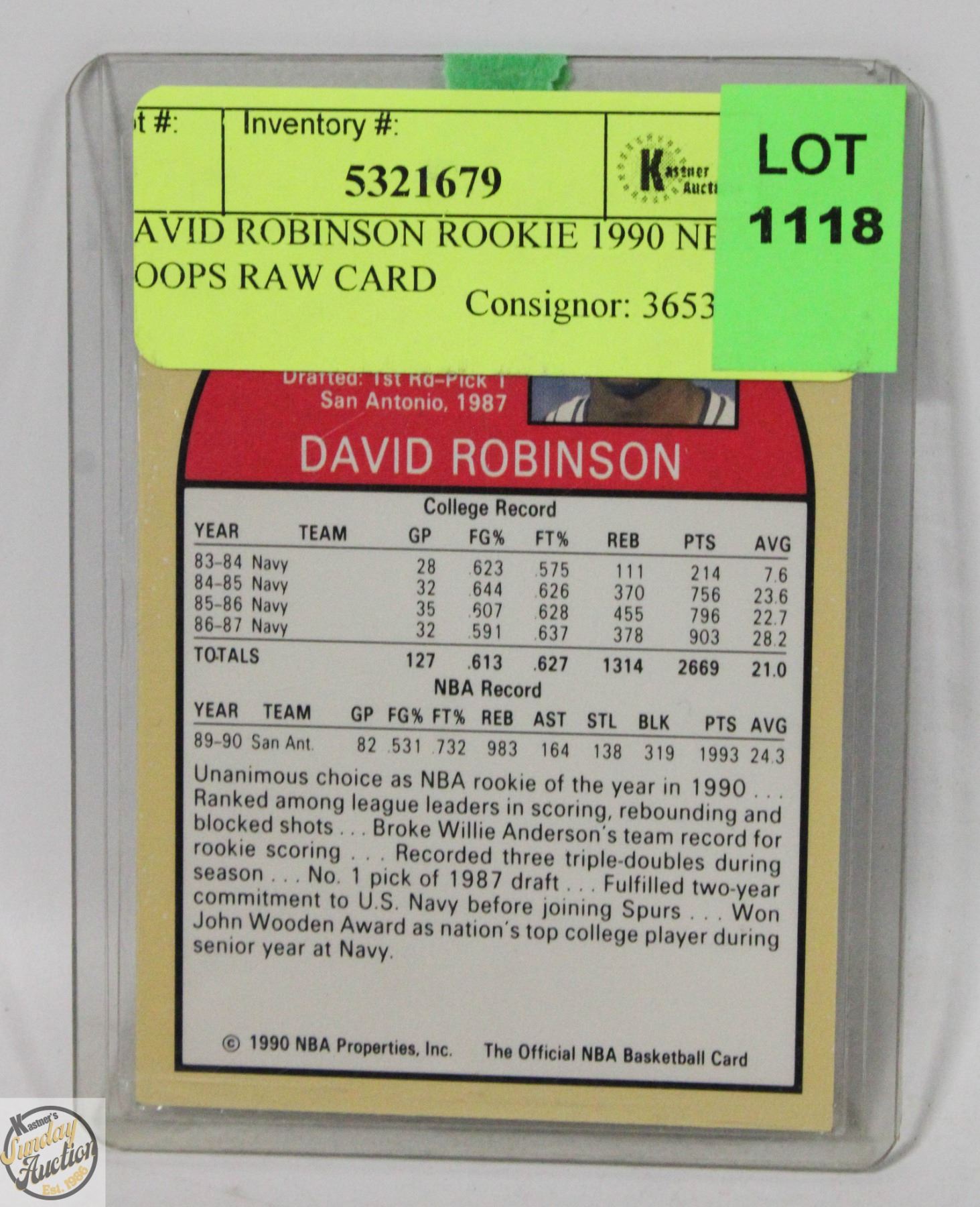 DAVID ROBINSON ROOKIE 1990 NBA HOOPS RAW CARD