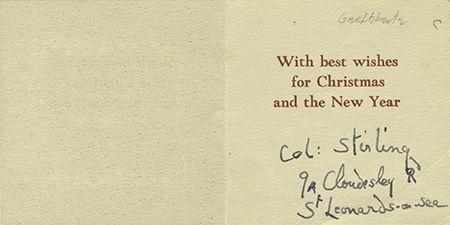 (1915 - 1990) British army officer and founder of the S.A.S. Before his capture, S.A.S. had destroyed over 250 aircraft on the ground, dozens of supply dumps, wrecked railways and telecommunications, and had put hundreds of enemy vehicles out of action...and Stirling had personally strangled 41 men. Small Christmas card, St. Leonards-on-Sea, [n.d.], signed Col: Stirling" at bottom adding his return address. Very good.