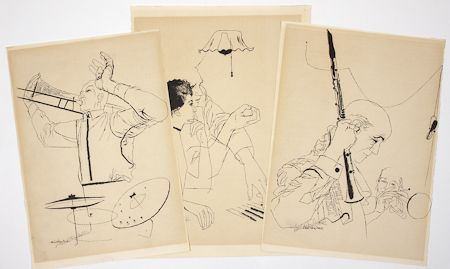 (1913-1992) Influential American artist best known for his illustrations for jazz albums. Fine grouping of three signed lithographs circa. 1960. Two are 16" x11 1/2" and one is 17 3/4" x12", b/w, on heavy stock archival paper, each depicting jazz musicians in performance and boldly signed in pencil across his printed signature. One bears a small repaired tear, otherwise fine. Three pieces.