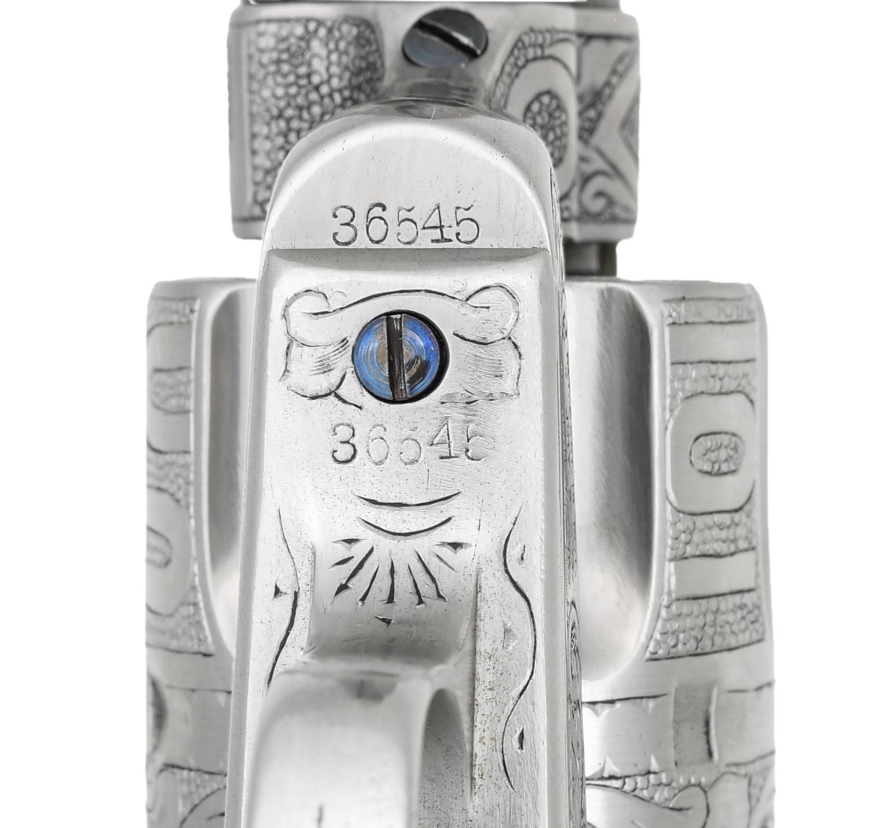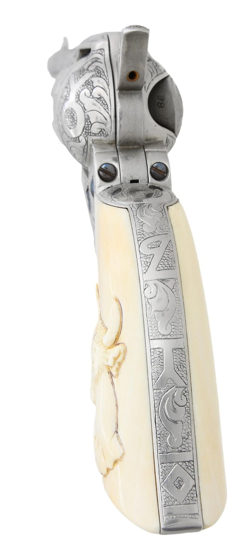 GENERATION SAA REVOLVER. Cal. 45 Colt. S# 36545. Bbl. 7 1/2" with Hartford address and blade sight. Black powder frame. 6-shot fluted cyl. Bullseye ejector head. Revolver has nearly full coverage engraving highlighting famous Texas ranches such as the 6666 and 101. Bbl., cyl., frame, and backstrap feature famous cattle brand markings surrounded by foliate scroll with punch dot backgrounds. Trigger guard has a sunburst on its bow with highlights around the S#. Frame, back strap, trigger guard, and bbl. have matching # "36545". Fully engraved cyl. has no visible S#. Loading gate is marked with assembled # "88". Custom antique nickel finish with fire blued ejector head, cyl. pin, and screws. 1-piece custom natural white grips with relief carved bulls head on left panel. UNATTACHED ACCESSORIES: Colt factory letter stating "Serial Number: 36545/ Caliber: .45/c/ Barrel Length: Not Listed/ Finish: Nickel/ Type of Stocks: Not Listed/ Shipped to: B. Kittredge & Company/ Address: Cincinnati, Ohio/ Date of Shipment: May 5, 1877/ Number of Same Type/ Guns in Shipment: 50". This example is also accompanied by a letter of authenticity from the engraver David Wade Harris. As well as a notarized letter dated 05/27/25, signed by Joe Roberts, retired Texas Special Ranger and Brand Inspector in West Texas for the Southwestern Cattle Raisers Association of Ft. Worth, Texas, stating that this was his personal revolver. CONDITION: fine as upgraded retaining over 98% antique style nickel refinish. Screws and fittings have very good fire blue. Action is tight. Bore has general light pitting with worn rifling having a ring bulge approx. 1 1/2" from the muzzle. Grips show evidence of checking at the butt. (01-27157/DS). ANTIQUE. $6,000-9,000.