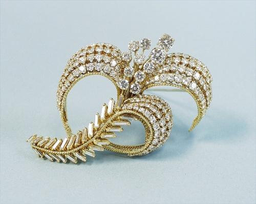 DAVID WEBB - An important 18 kt. yellow gold and diamond brooch in form of a stylized palm tree, set with an arrangement of high quality brilliant and baguette cut diamonds, total approximate weight 16 cts. Exceptional design and workmanship, fully marked. Circa 1980.