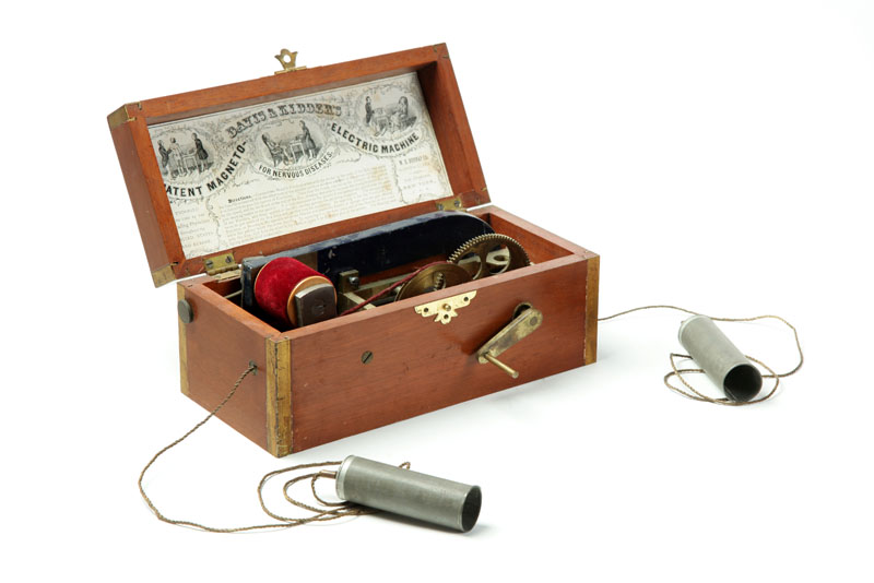 W.H.Burnap, New York, 2nd half-19th century, wood, mixed metals. Quack medical devise produces electrical current to cure nervous diseases. 4 1/2"h. 10"w. 4 1/2"w.