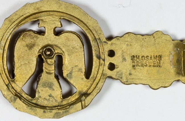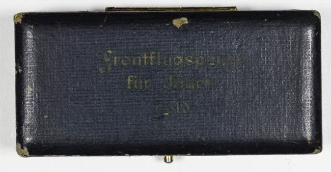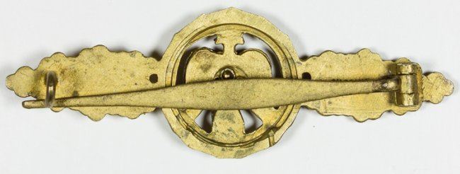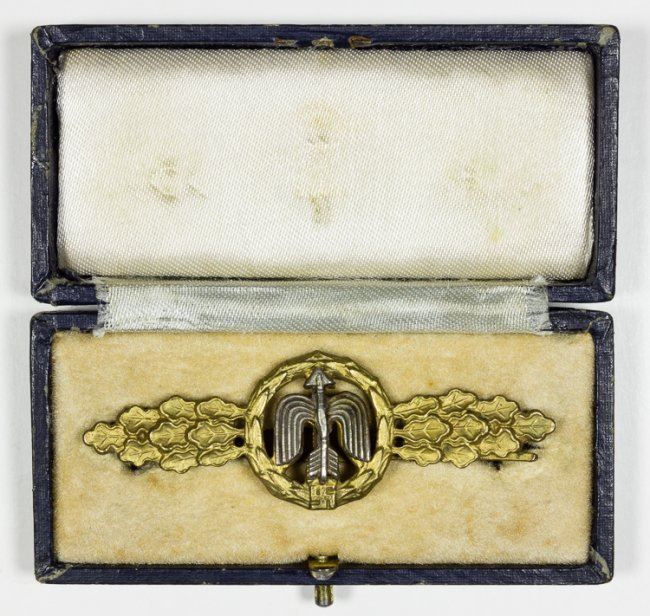 Luftwaffe Day Fighter Flight Clasp in Gold, 2 7/8" long, backstamped by G. H. Osang, Dresden. In the original fitted presentation case. Arrow has been slightly deformed, else very good.