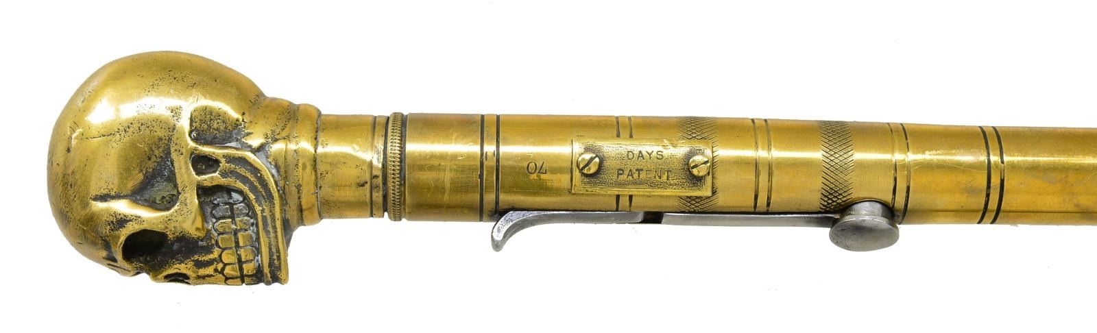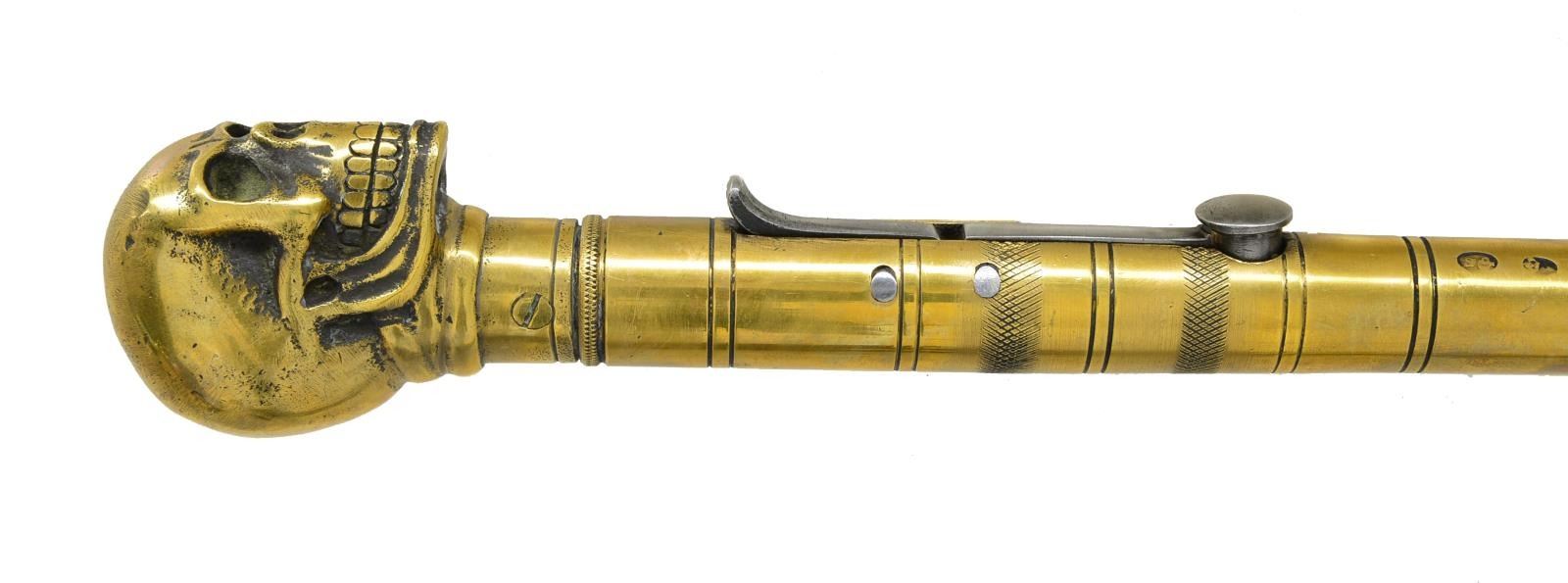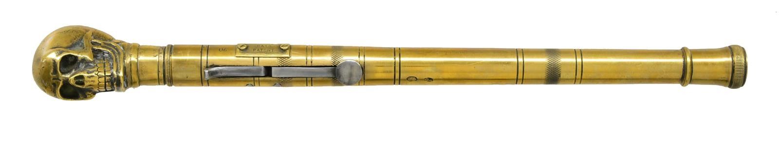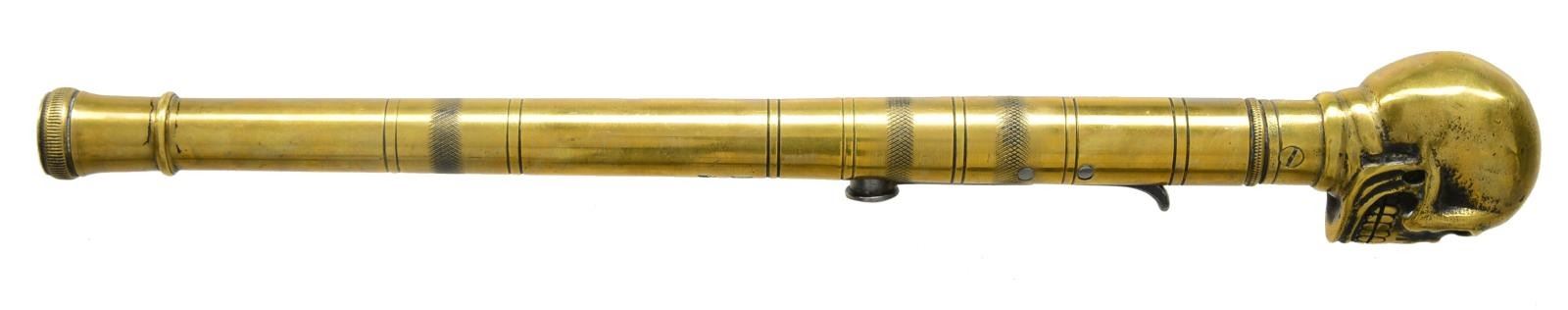 Cal. about 40. S# 70. Overall length 15 5/8" w/ 7 7/8" smooth bore that flares to 58 cal. at muzzle. Solid brass pistol features a skull at butt w/ faceted transition to bbl. w/ dbl. line & crosshatch sectioning marks leading to a faceted cannonade muzzle. Iron percussion underhammer & trigger. Screw attached plate is stamped "DAY'S PATENT". Mid section of bbl. has British view & proof marks. CONDITION: brass has cleaned bright appearance. Functioning mechanics. Dark corroded bore. (01-17990/DS). ANTIQUE. $2,000-3,000.