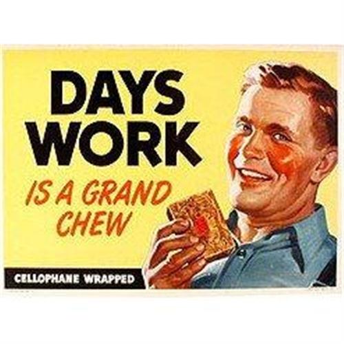 DAYS WORK TOBACCO CARDBOARD SIGN -- 1949, c14? x 19?, cardboard sign, colorful workman holding tobacco plug, "Day Work is a Grand Chew - Cellophane Wrapped"