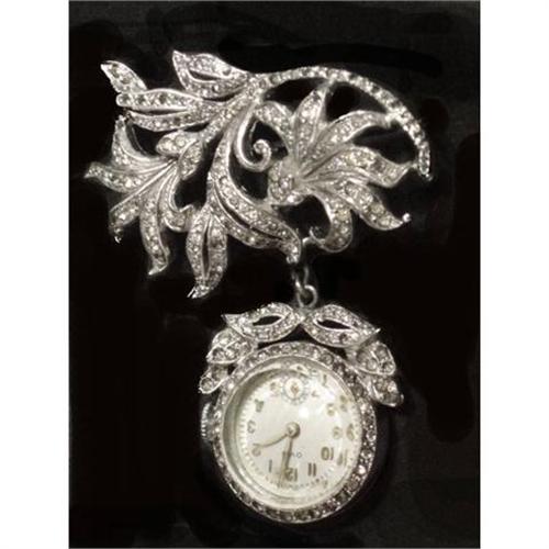 Much brighter and whiter than the photos this dazzling eye catching all rhinestone art deco pendant and watch are extremely GORGEOUS with a capital G. Looks like something you see in the art deco genuine jewelry catalogs. If this was in white gold it would be worth a small fortune. This is a really well made Swiss watch set that has over 100 hand set rhinestones. When the light catches this it really sparkles. The brooch is 2 1/4" long and 2" wide. The watch is the only thing that has gold on it and that is on the numbers and the hands. It is a Swiss made watch called Ovis. I am selling this as a brooch because the watch appears to be overwound. It is far prettier than the photos and I guarantee you will get a lot of compliments on it. The stones are glass and like marcasites, they have some that are darker which tends to give these depth. It is a fine watch that seems to be of really good quality. I wish I knew more about it.