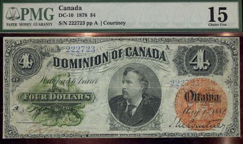 DC-10 1882 $4 No.222723 Courtney "PMG F15". A very nice and bright example. Rare in this conditon.