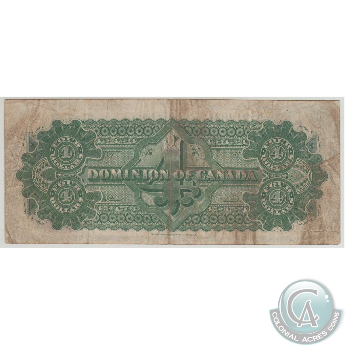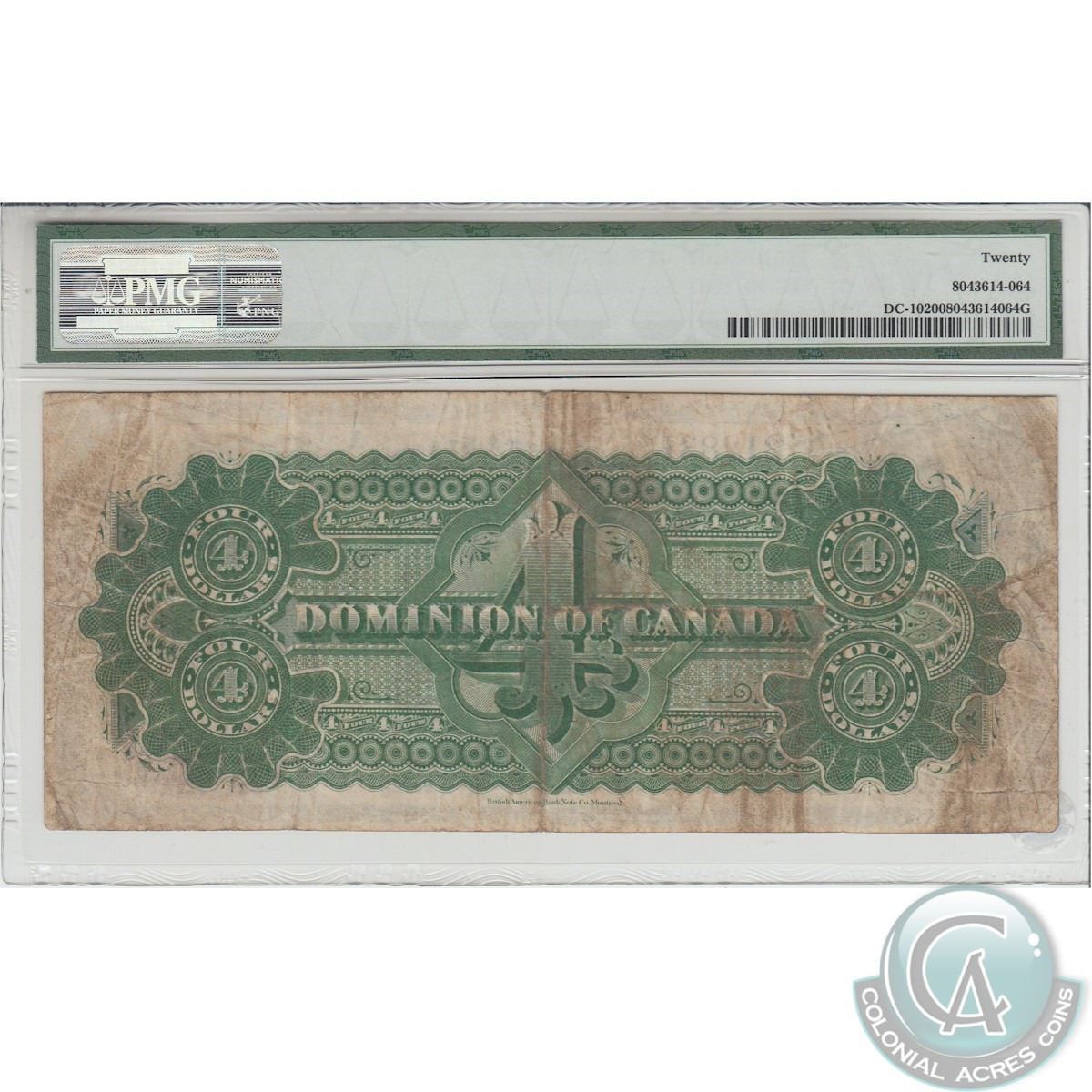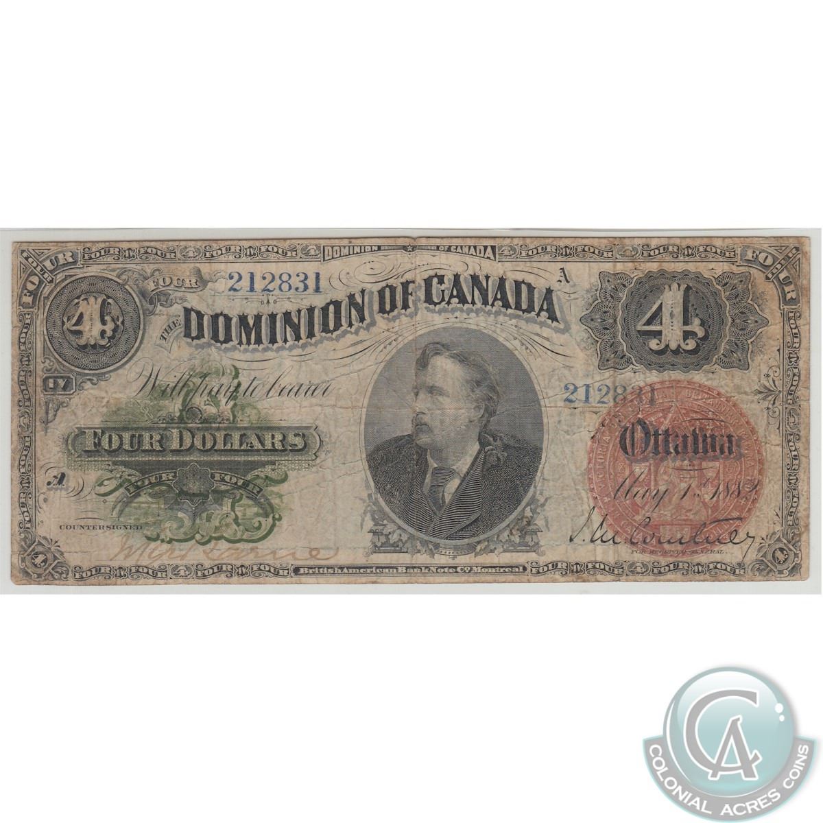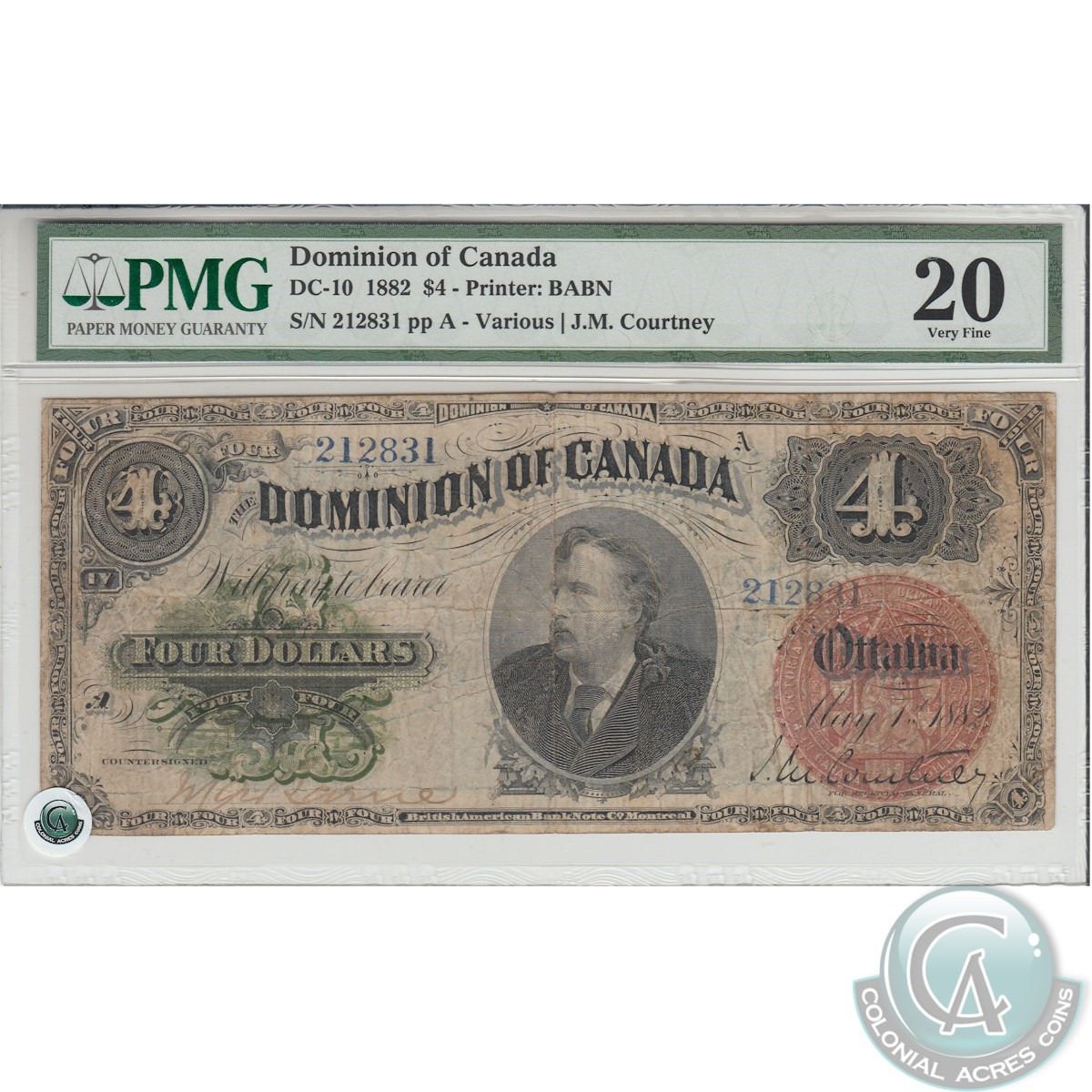 DC-10. 1882 Dominion of Canada $4, Various-Courtney, S/N: 212831/A, PMG VF-20. The note has a few pinholes.