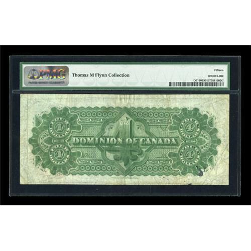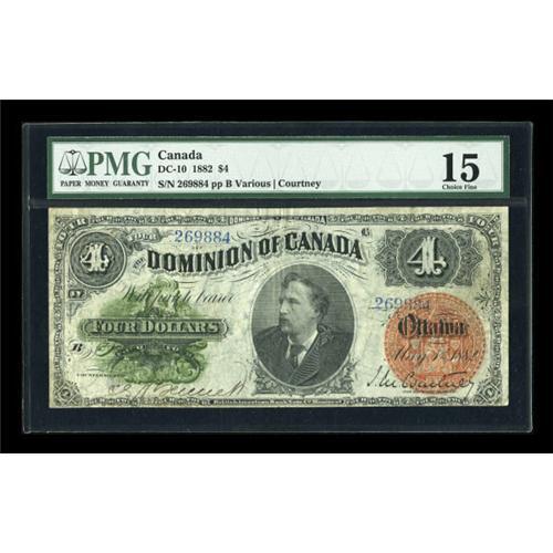 <B></B></I><BR> Notes of this denomination were issued after an 1880 law allowed the Dominion Government the sole authority to issue $4 notes, restricting the chartered banks whose charters were due for renewal to denominations of $5 and its multiples. This was the first series of fours issued, and the first Dominion currency not to be made payable at a specific Assistant Receiver General's office. PMG <B>Choice Fine 15,</B></I> an attractive piece with claims to an even higher grade. <BR><I>From The Thomas M. Flynn Collection</B></I><BR><BR><b>Shipping:</b> Coins & Currency (<a target="_blank" href="http://www.heritageauctions.com/common/shipping.php">view shipping information</a>)