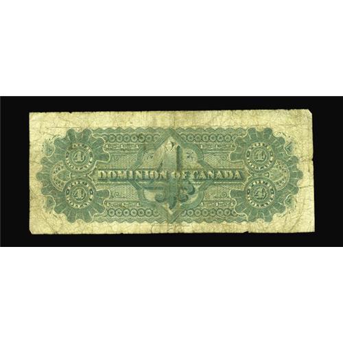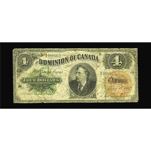 <B>DC-10 $4 Dominion of Canada 1882</B></I><BR>This tough note certainly has been well used, but is complete. There are a few pinholes noticed. <B>Good-Very Good.</B></I>