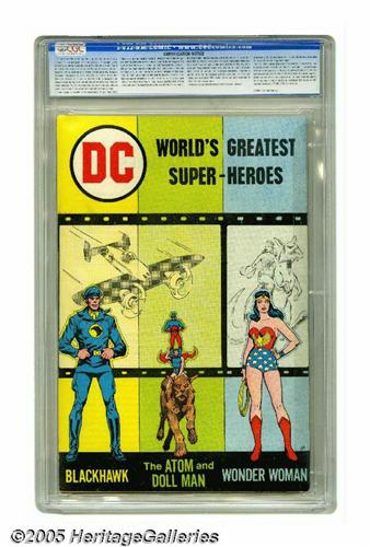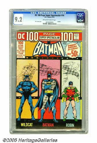 <B>DC 100-Page Super Spectacular #14 (DC, 1973) CGC NM- 9.2 Off-white to white pages.</B></I> Also known as issue DC-14. Wraparound cover by Nick Cardy. Batman, the Atom, Blackhawk, Wonder Woman, Doll Man, and WIldcat are featured. Bob Kane, Dick Sprang, Gil Kane, Reed Crandall, H. G. Peter, and Irwin Hasen art. Overstreet 2005 NM- 9.2 value = $90. CGC census 3/05: 3 in 9.2, 5 higher.