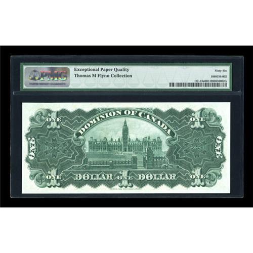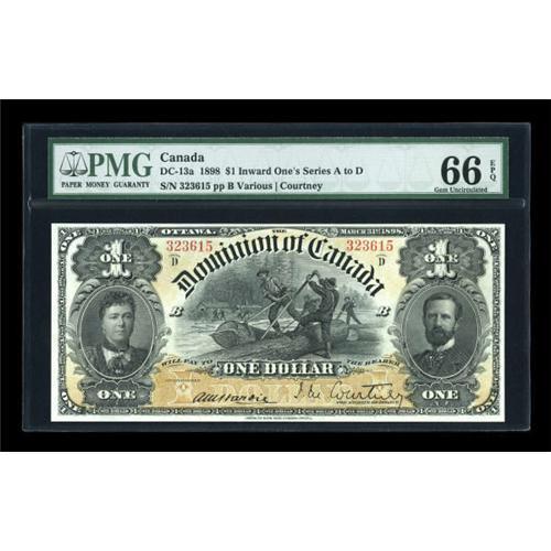 <B>DC-13a $1 1898</B></I><BR> This is an incredible note which may well be among the two or three finest 19th century Canadian government issues extant. Totally original and displaying spectacular colors and print quality, it is so far above most notes of this era in grade that it deserves every accolade possible. PMG <B>Gem Uncirculated 66 EPQ, </B></I>truly a marvel of survival and one of the highlights of the Flynn collection. <BR><I>From The Thomas M. Flynn Collection</B></I><BR><BR><b>Shipping:</b> Coins & Currency (<a target="_blank" href="http://www.heritageauctions.com/common/shipping.php">view shipping information</a>)