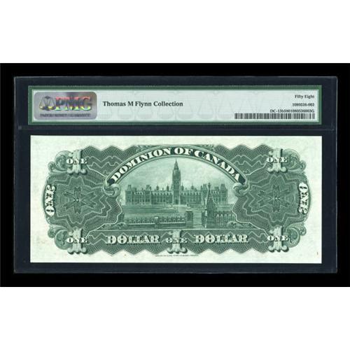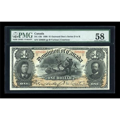 <B>DC-13b $1 1898</B></I><BR> A second unusually high grade example from the Flynn holdings. This is the slightly more common variety with the second back used on this design, with the "Ones" curving outward rather than inward. PMG <B>Choice About Uncirculated 58, </B></I>a rare note in this grade. PMG has graded 24 DC-13b notes to date, with the highest grade (save for this example) Extremely Fine 40.<BR><I>From The Thomas M. Flynn Collection</B></I><BR><BR><b>Shipping:</b> Coins & Currency (<a target="_blank" href="http://www.heritageauctions.com/common/shipping.php">view shipping information</a>)