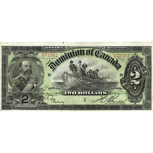 <B>DC-14c $2 1897</B></I><BR>It is the unusual collection indeed which includes two truly high grade 1897 twos, but the Halton Lake holdings manage that feat. This piece is separated from uncirculated by two light bends that are barely discernible without close examination. The inks are bright, the colors as new, and the originality unquestioned. <B>Extremely Fine-About Uncirculated.</B></I><BR><I>From The Halton Lake Collection</B></I>