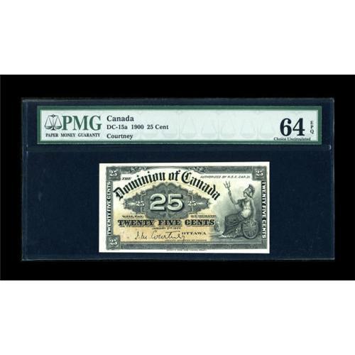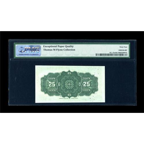 <B>DC-15a 25c 1900</B></I><BR> Notes from the 1900 fractional issue are among the very most common items in low grade, but strictly uncirculated specimens are considerably more difficult to obtain. This piece is PMG graded <B>Choice Uncirculated 64 EPQ </B></I>and is the only PMG graded DC-15a to reach the uncirculated level.<BR><I>From The Thomas M. Flynn Collection</B></I><BR><BR><b>Shipping:</b> Coins & Currency (<a target="_blank" href="http://www.heritageauctions.com/common/shipping.php">view shipping information</a>)