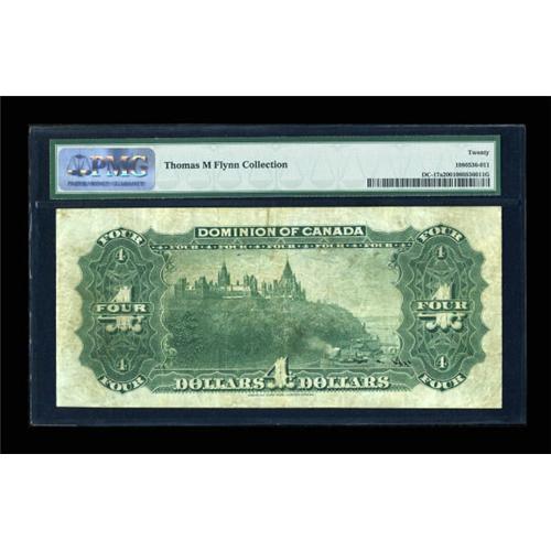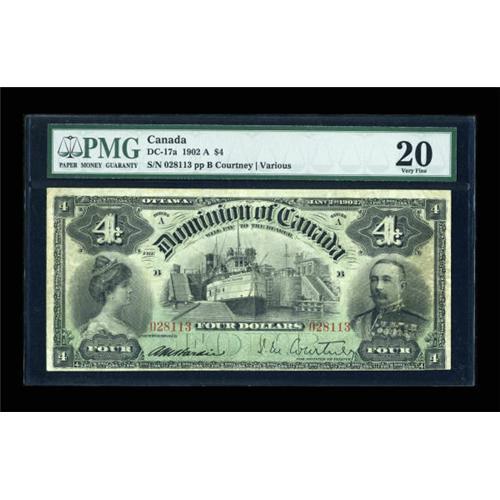 <B>DC-17a $4 1902</B></I><BR> This series was issued after the embarrassment of the 1900 $4 issue, which depicted the American rather than the Canadian locks of the Sault Ste. Marie canal, which connects Lake Superior and Lake Huron. The portraits of the Countess and Earl of Minto remain unchanged from the earlier issue. This is one of the most popular Canadian issues, due both to its design and its denomination. PMG <B>Very Fine 20,</B></I> a nice circulated specimen.<BR><I>From The Thomas M. Flynn Collection</B></I><BR><BR><b>Shipping:</b> Coins & Currency (<a target="_blank" href="http://www.heritageauctions.com/common/shipping.php">view shipping information</a>)