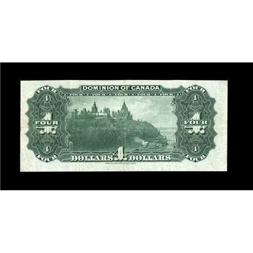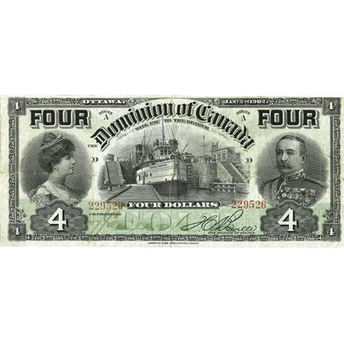 <B>DC-17b $4 1902</B></I><BR>This note bears the third design used in this series with the face being substantially re-worked. While the number of these printed was substantially higher than the two earlier notes in this series, the number of survivors is not all that much higher, as these notes did not enter circulation until 1911. After barely a year, the Canadian authorities elected to withdraw the $4 denomination in favor of the $5, and by 1915 the number of $4 bills in circulation had declined to virtually nothing. <B>Very Fine.</B></I><BR><I>From The Halton Lake Collection</B></I>