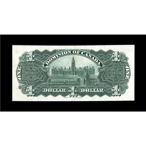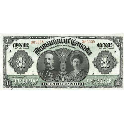<B>DC-18a $1 1911</B></I><BR>A high grade example of this attractive note, which displays portraits of Lord and Lady Grey. Earl Grey was Governor General of Canada from 1904 to 1911, and was one of the most popular holders of that office, with his term extended at the request of the Canadian government. This example is a bright <B>Extremely Fine-About Uncirculated</B></I> piece that appears new until closely examined.<BR><I>From The Halton Lake Collection</B></I>