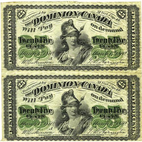<B>DC-1a 25c 1870 Uncut Vertical Pair.</B></I><BR>Pairs for this number are not listed in Charlton. However, here is proof that at least one "A" pair exists. <B>Fine,</B></I> pinholes.<BR><I>From The Collection of Richard A. Beck</B></I>
