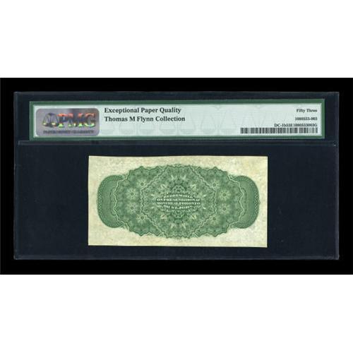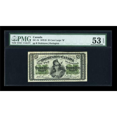 <B>DC-1b 25c 1870</B></I><BR> A Series "B" note with the large "B." While quite common in lower grades, high grade examples are very tough to find. PMG has graded only five examples to date, with this piece the only specimen higher than Fine 15. PMG <B>About Uncirculated 53 EPQ.</B></I><BR><I>From The Thomas M. Flynn Collection</B></I><BR><BR><b>Shipping:</b> Coins & Currency (<a target="_blank" href="http://www.heritageauctions.com/common/shipping.php">view shipping information</a>)