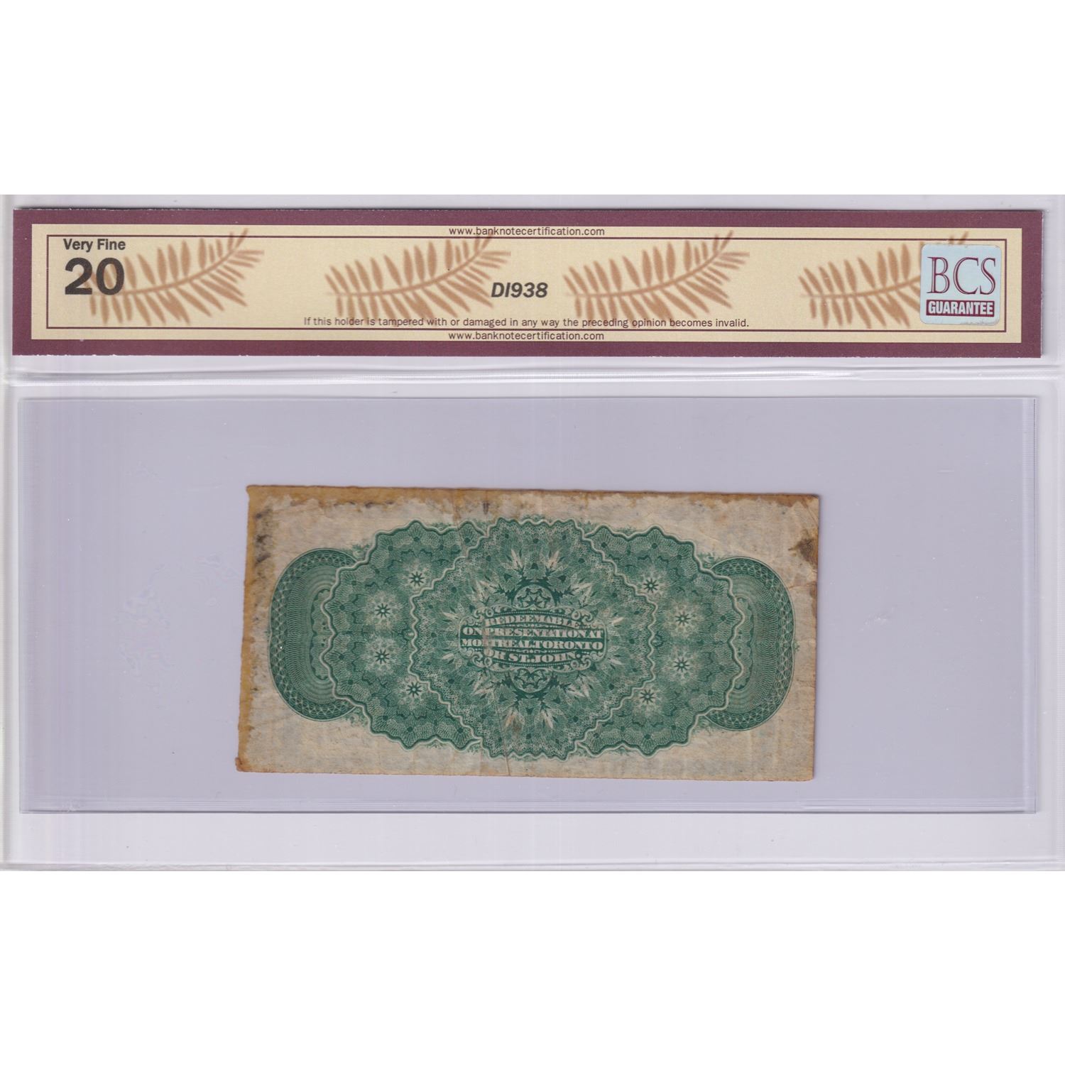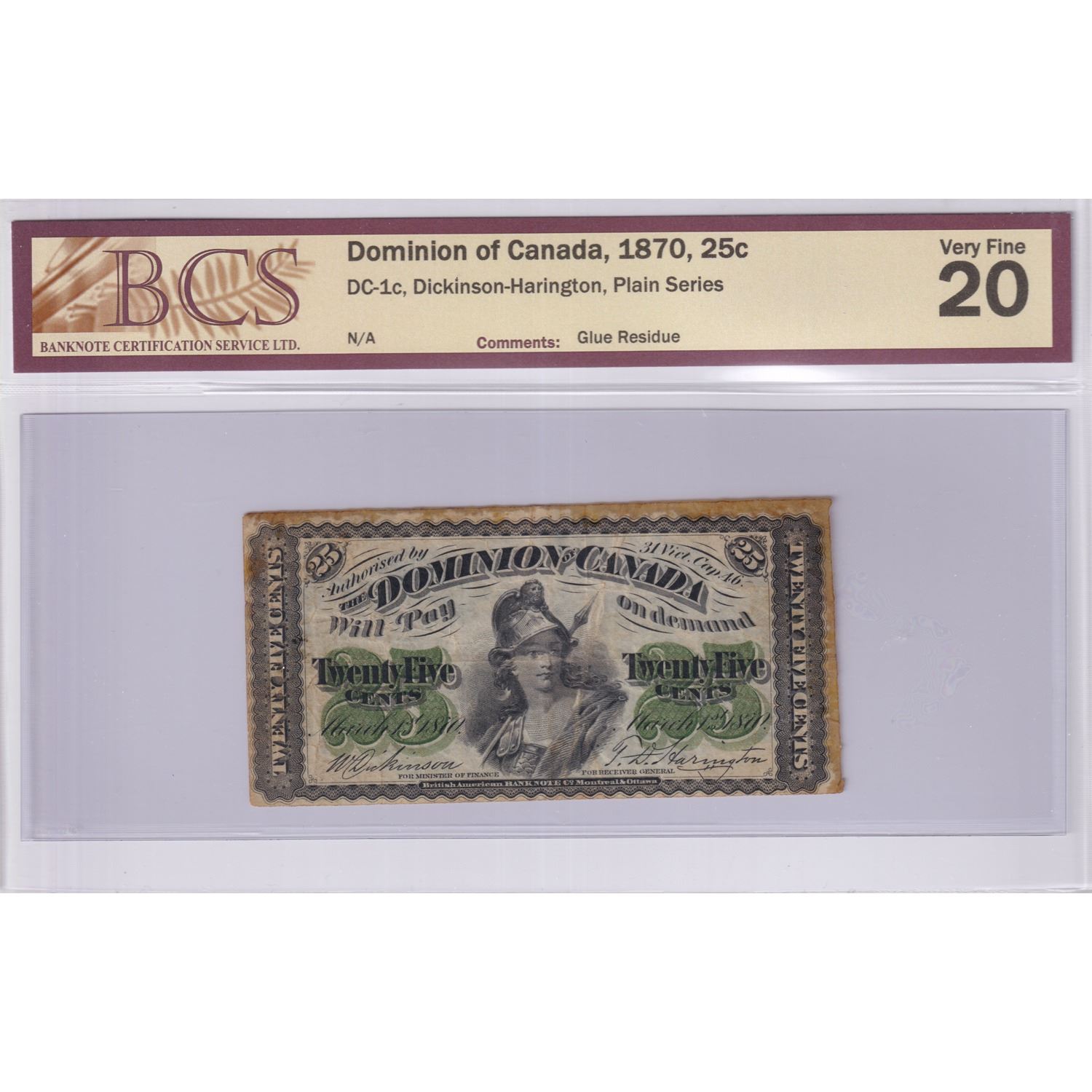 DC-1c 1870 Dominion of Canada 25-cent Shinplaster, Dickson-Harington, Plain Series. BCS Certified VF-20 (glue residue)