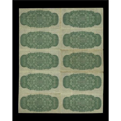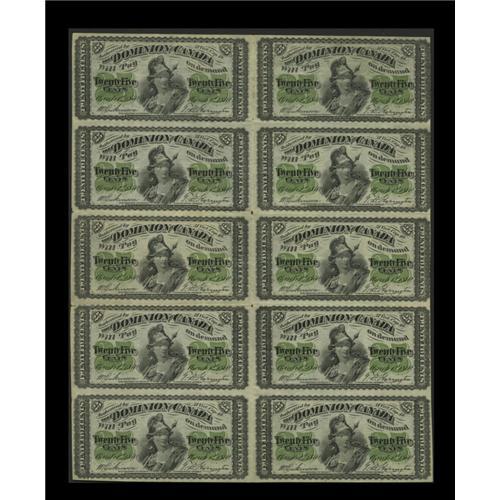 <B>DC-1c 25¢ 1870 Uncut Sheet of Ten.</B></I><BR>This is an important piece of Canadian paper money history and we have two for you to choose from. In fact the Charlton reference does not list any ten-subject uncut sheets for this design. We have been told there is a total of three and two are in this auction. The main folds of this sheet are down the center and between the notes. There is also three small spots of paper separation along the center axis. A couple of edge tears are noticed with the longest being an approximate one inch tear at the top of the fourth note. There is also a little more handling displayed, but each note would grade <B>Extremely Fine.</B></I> One note has also toned a shade on its back, but the rest of this fantastic sheet is bright.<BR><I>From The Collection of Richard A. Beck</B></I>