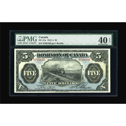 <B>DC-21a $5 1912</B></I><BR> This No Seal Boville note is simply a wonderful Train note with plenty of paper originality. <B>PMG Extremely Fine 40 EPQ.<BR></B></I><I>From The Walla Walla Collection</B></I><BR><BR><b>Shipping:</b> Coins & Currency (<a target="_blank" href="http://www.heritageauctions.com/common/shipping.php">view shipping information</a>)