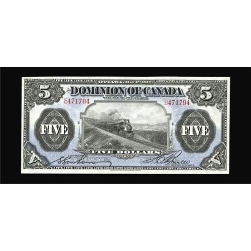 <B>DC-21c $5 1912</B></I><BR>A lovely example of the always popular "train" note with better than normal centering for this issue. This piece is fully original and displays great paper quality and bold vibrant colors. <B>Crisp Uncirculated,</B></I> a premium specimen.<BR><I>From The Halton Lake Collection</B></I>