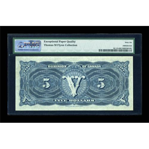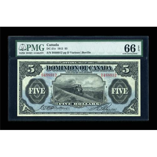 <B>DC-21c $5 1912</B></I><BR> The first of enough 1912 Train notes to fill a small station. This is about as close to perfection as any Train note will likely ever reach, as it is a perfectly centered and screamingly original example with colors as bright as the moment it left the press. Interestingly, it does not come from either of the well known DC-21c hoards with the 4650 and 4717 numbers. PMG <B>Gem Uncirculated 66 EPQ, </B></I>a spectacular note deserving of a place in the finest of collections. <BR><I>From The Thomas M. Flynn Collection</B></I><BR><BR><b>Shipping:</b> Coins & Currency (<a target="_blank" href="http://www.heritageauctions.com/common/shipping.php">view shipping information</a>)