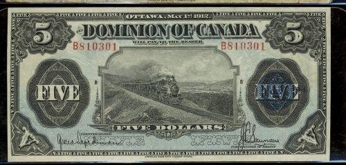 DC-21e 1912 $5 B810301 Hyndman-Saunders, seal/five. A nice, clean and original EF+ example. Very rare note!
