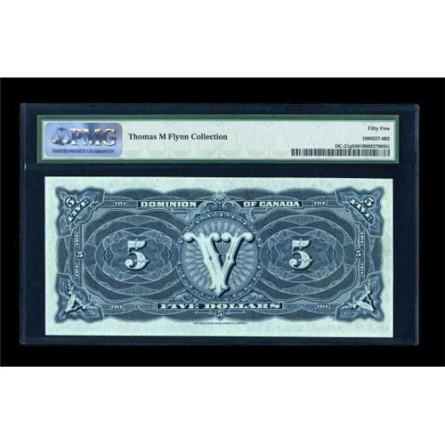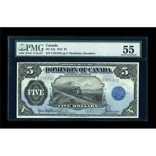 <B>DC-21g $5 1912</B></I><BR> The final collectible $5 1912 variety, here housed in a PMG <B>About Uncirculated 55 </B></I>holder. This is a very pretty example, with the back printed in an especially rich blue color. <BR><I>From The Thomas M. Flynn Collection</B></I><BR><BR><b>Shipping:</b> Coins & Currency (<a target="_blank" href="http://www.heritageauctions.com/common/shipping.php">view shipping information</a>)