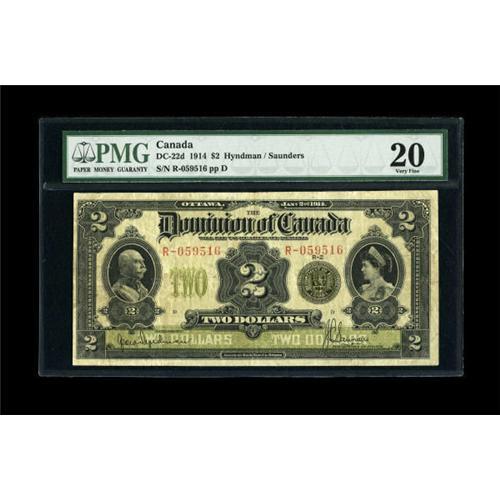 <B>DC-22d $2 1914.</B></I><BR> This is a nice mid-grade example of this attractively designed $2 note, which features facing portraits of the Duke and Duchess of Connaught. <B>PMG Very Fine 20.</B></I><BR><BR><b>Shipping:</b> Coins & Currency (<a target="_blank" href="http://www.heritageauctions.com/common/shipping.php">view shipping information</a>)