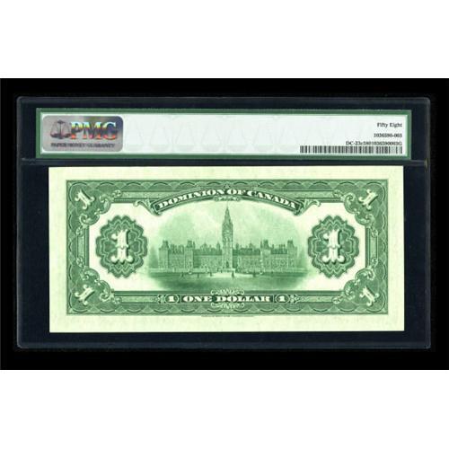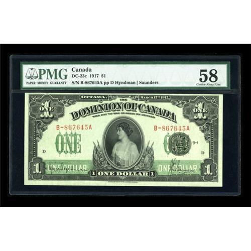 <B>DC-23c $1 1917</B></I><BR> A high end example of the Princess Patricia note which has been encapsulated by PMG and assigned a grade of <B>Choice About Uncirculated 58.<BR></B></I><I>From The John Ameen Collection</B></I><BR><BR><b>Shipping:</b> Coins & Currency (<a target="_blank" href="http://www.heritageauctions.com/common/shipping.php">view shipping information</a>)