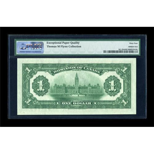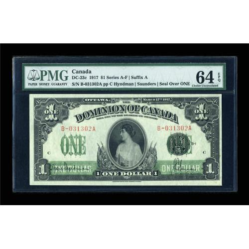 <B>DC-23c $1 1917</B></I><BR> The DC-23c is the scarcest of the 1917 $1 varieties in all grades. Fortunately for collectors, Tom early on obtained a lovely and fully original example which has now become the highest specimen graded by PMG. Bright <B>Choice Uncirculated 64 EPQ, </B></I>a premium piece worthy of a very strong bid. <BR><I>From The Thomas M. Flynn Collection</B></I><BR><BR><b>Shipping:</b> Coins & Currency (<a target="_blank" href="http://www.heritageauctions.com/common/shipping.php">view shipping information</a>)