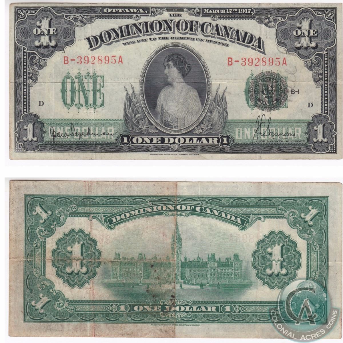 DC-23c. 1917 Dominion of Canada $1, Hyndman-Saunders, Seal Over ONE, S/N: B-392895A/D in VF-EF Condition. The note has some writing on the face.