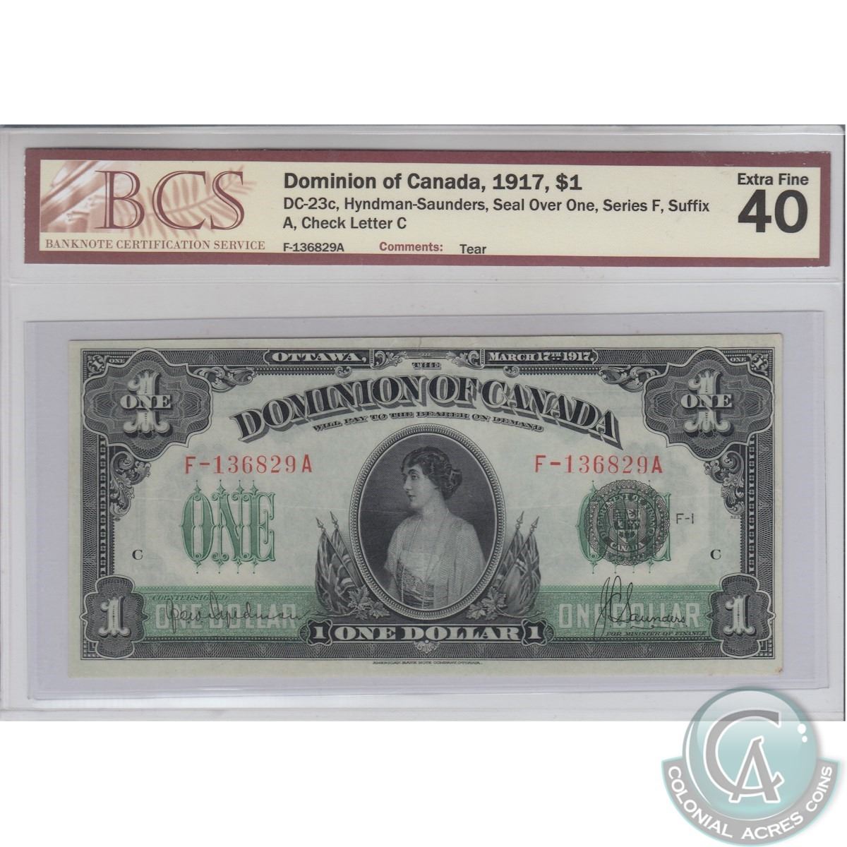 DC-23c. 1917 Dominion of Canada $1, Hyndman-Saunders, Seal over ONE, Series F, S/N: F-136829A/C, BCS EF-40(tear)