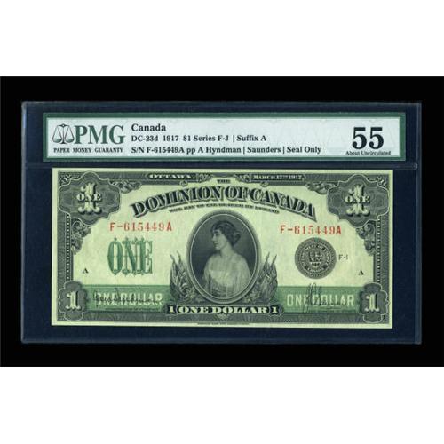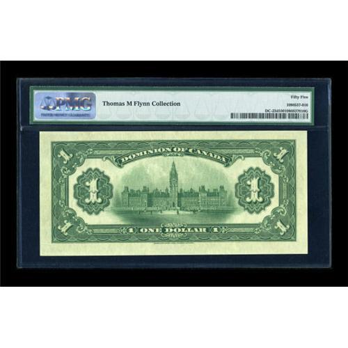 <B>DC-23d $1 1917</B></I><BR> A high grade example of the last of the Princess Patricia notes. PMG <B>About Uncirculated 55.</B></I><BR><I>From The Thomas M. Flynn Collection</B></I><BR><BR><b>Shipping:</b> Coins & Currency (<a target="_blank" href="http://www.heritageauctions.com/common/shipping.php">view shipping information</a>)