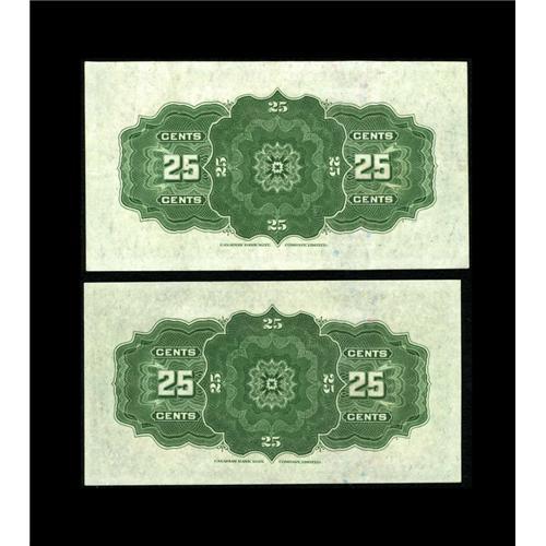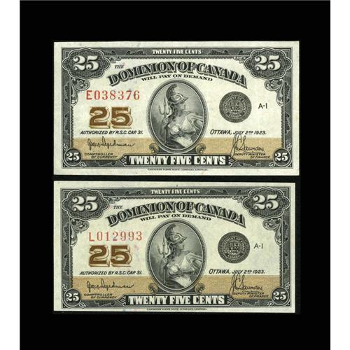 <B>DC-24a 25¢ 1923. Two Examples.</B></I> Here are two "Authorized" issues. The <B>Extremely Fine</B></I> note has four wide margins and the handling consists of a vertical and lateral center folds. The <B>Crisp Uncirculated</B></I> note has an uneven cut along the bottom edge.<BR><I>From The Halton Lake Collection</B></I>