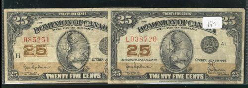 DC-24a and 24b 1923 25 cents "shinplasters" Hyndman. Grades vary from VG to Fine. 2 notes.