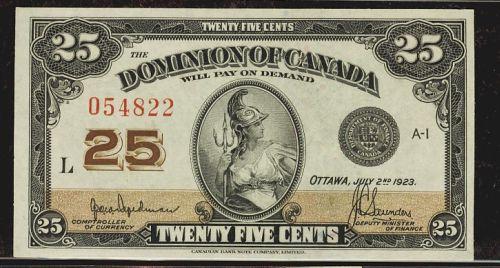 DC-24b 1923 25 cents "Hyndman-Saunders" 054822 "L" Choice uncirculated.