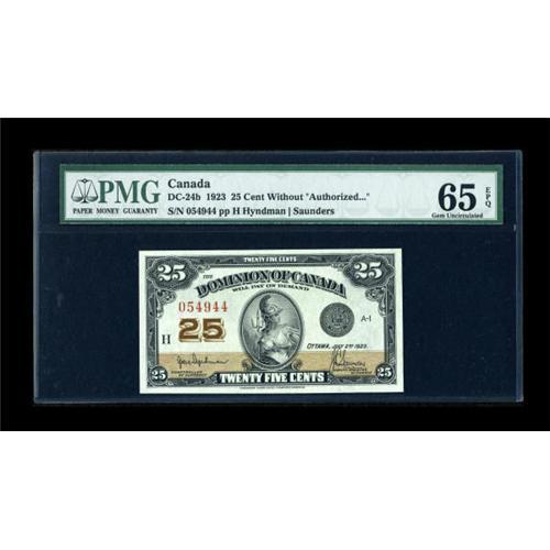 <B>DC-24b 25c 1923</B></I><BR> The second type issued in this series, this with the "Authorized" clause removed. The Flynn holdings have another lovely example, with this piece PMG graded <B>Gem Uncirculated 65 EPQ. </B></I>It's the finest of the three examples of this number PMG has graded to date. <BR><I>From The Thomas M. Flynn Collection</B></I><BR><BR><b>Shipping:</b> Coins & Currency (<a target="_blank" href="http://www.heritageauctions.com/common/shipping.php">view shipping information</a>)
