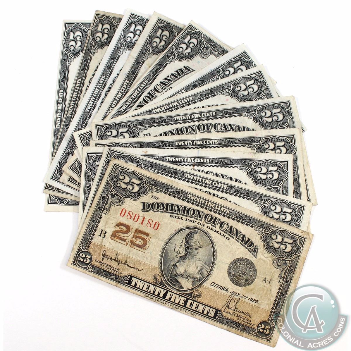 DC-24b. Estate Lot of Twelve 1923 Dominion of Canada 25c, Hyndman-Saunders, Not AUTHORIZED in the following grades. 1 x F, 2 x F-VF, 6 x VF, and 3 x VF-EF. 12 pcs.