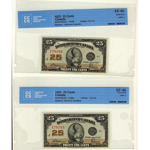 DC-24c 1923 25¢ #170285, #170826 CCCS EF45. Lot of two consecutive notes.