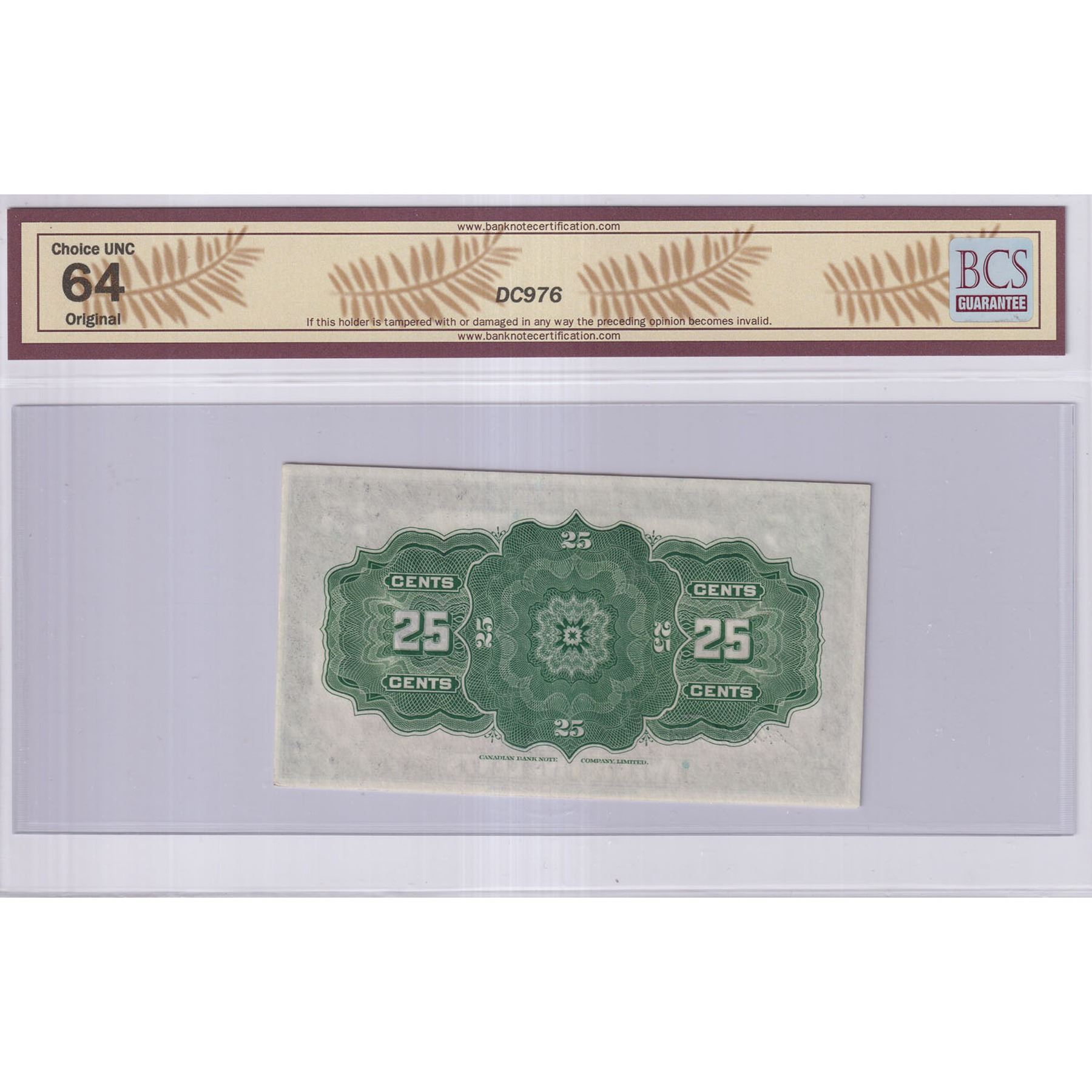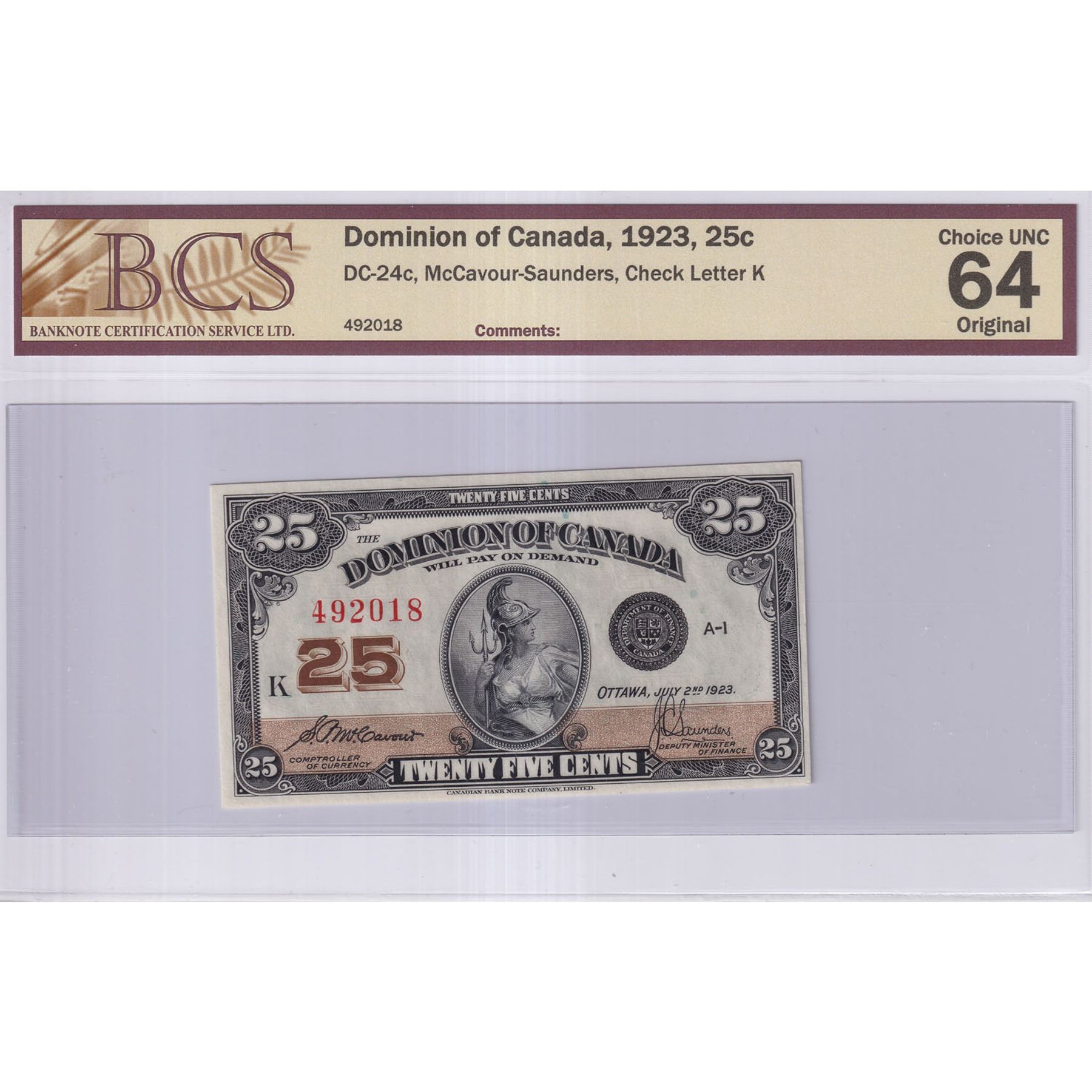 DC-24c 1923 Dominion Of Canada 25c, McCavour-Saunders S/N: 492018, BCS Certified Choice UNC-64 Original! A near Pristine Note with all around great eye appeal.