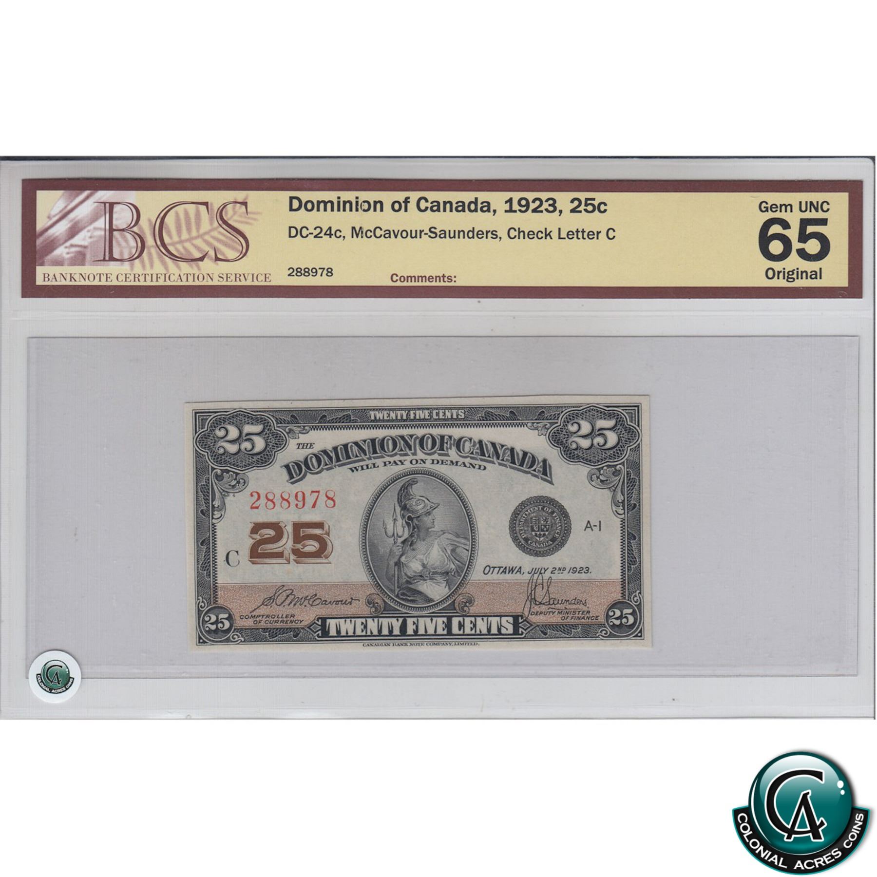 DC-24c 1923 Dominion of Canada 25c, McCavour-Saunders, S/N: 288978/C BCS GEM UNC-65 Original