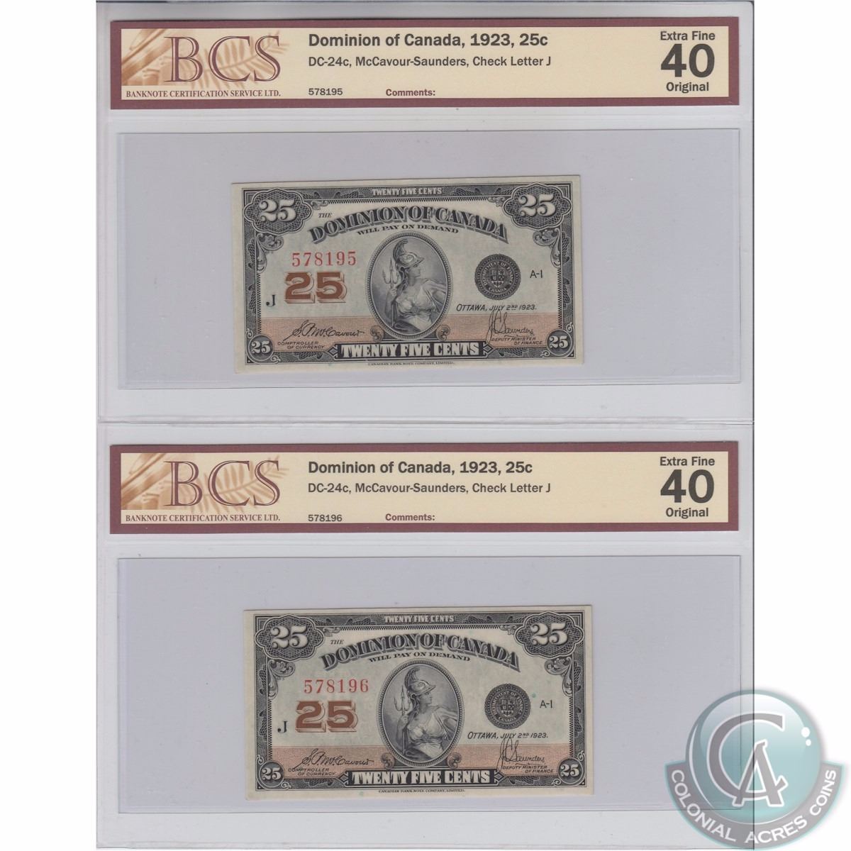 DC-24c. Pair of Consecutive Low serial numbered 1923 Dominion of Canada 25c, McCavour-Saunders, S/N: 578195/6, BCS Certified EF-40, Original. 2pcs