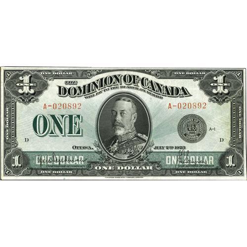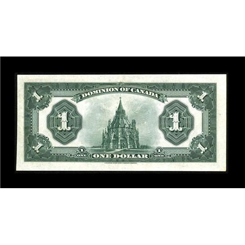 <B>DC-25a $1 1923.</B></I><BR>Wonderful color on this <B>Extremely Fine-About Uncirculated</B></I> note that has a tiny light spot on the back to the right of the Library of Parliament.<BR><I>From The Halton Lake Collection</B></I>