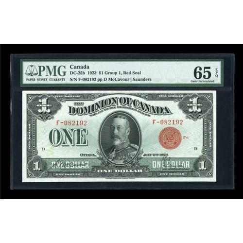 <B>DC-25b $1 1923</B></I><BR> The Flynn collection contains an unusually diverse group of the 1923 $1 issues, including examples of all of the test and experimental notes. Many of the other notes are unusually high grade for their issues, including this lovely PMG <B>Gem Uncirculated 65 EPQ </B></I>Red Seal, the finest by a huge margin to be graded by PMG to date. <BR><I>From The Thomas M. Flynn Collection</B></I><BR><BR><b>Shipping:</b> Coins & Currency (<a target="_blank" href="http://www.heritageauctions.com/common/shipping.php">view shipping information</a>)