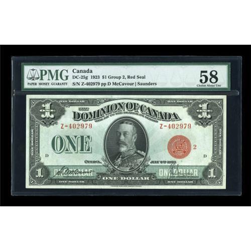 <B>DC-25g $1 1923</B></I><BR> A high grade Group 2 red seal with blazing colors and great centering. PMG <B>Choice About Uncirculated 58.</B></I><BR><I>From The Thomas M. Flynn Collection</B></I><BR><BR><b>Shipping:</b> Coins & Currency (<a target="_blank" href="http://www.heritageauctions.com/common/shipping.php">view shipping information</a>)