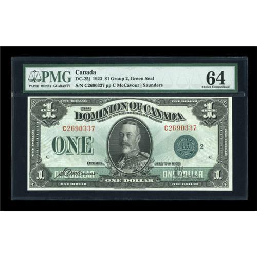 <B>DC-25j $1 1923</B></I><BR> A PMG graded <B>Choice Uncirculated 64</B></I> example of this Group 2 green seal note from the Flynn collection. Only one note of the nine graded by PMG is nicer than this specimen, and that by one point.<BR><I>From The Thomas M. Flynn Collection</B></I><BR><BR><b>Shipping:</b> Coins & Currency (<a target="_blank" href="http://www.heritageauctions.com/common/shipping.php">view shipping information</a>)